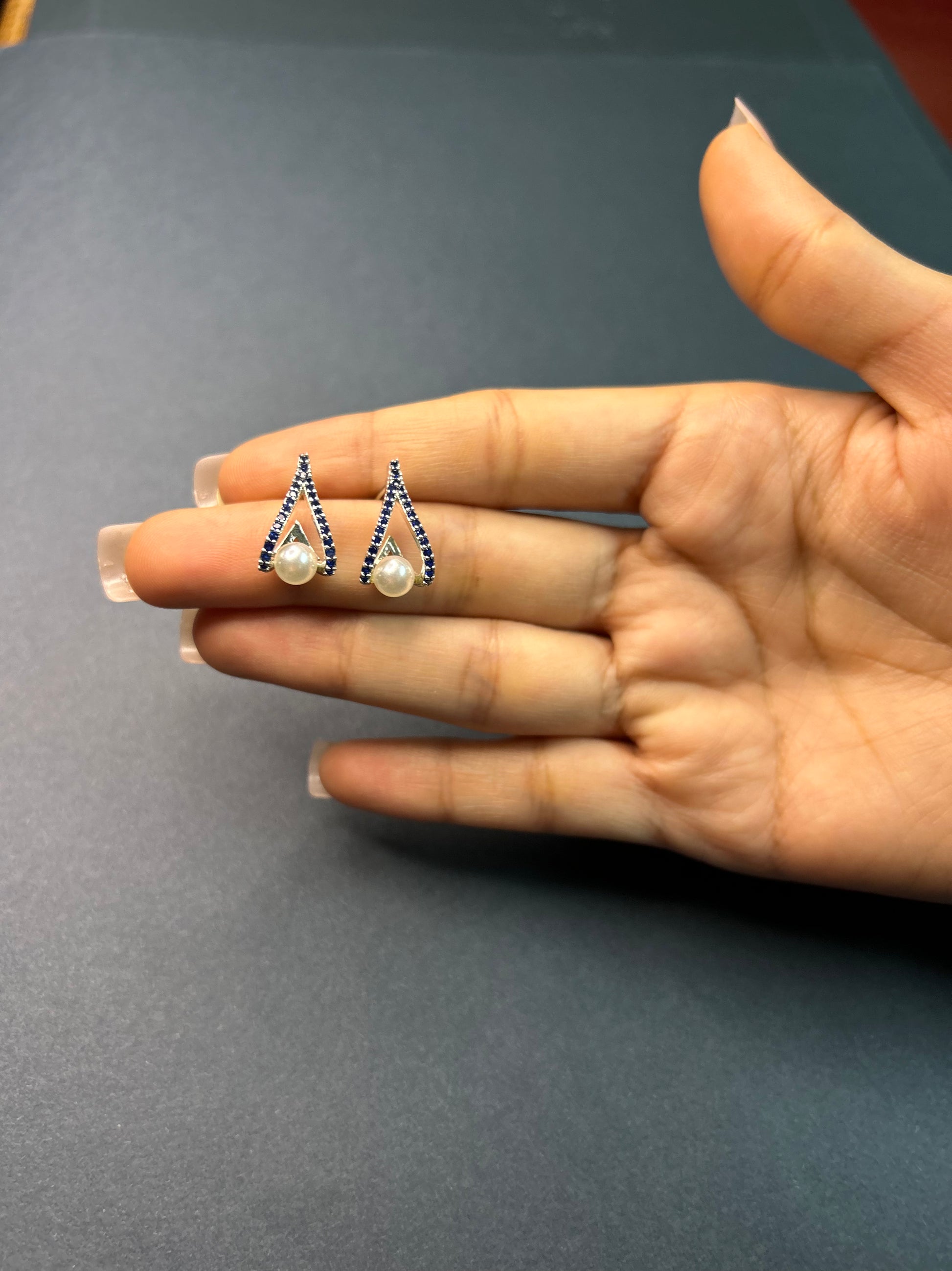 The Aura Swirl Earrings are inspired by graceful motion — a swirl of brilliance that frames a luminous pearl at its heart. Accented with deep blue stones, they evoke a sense of harmony and elegance, designed to capture attention with refined subtlety.