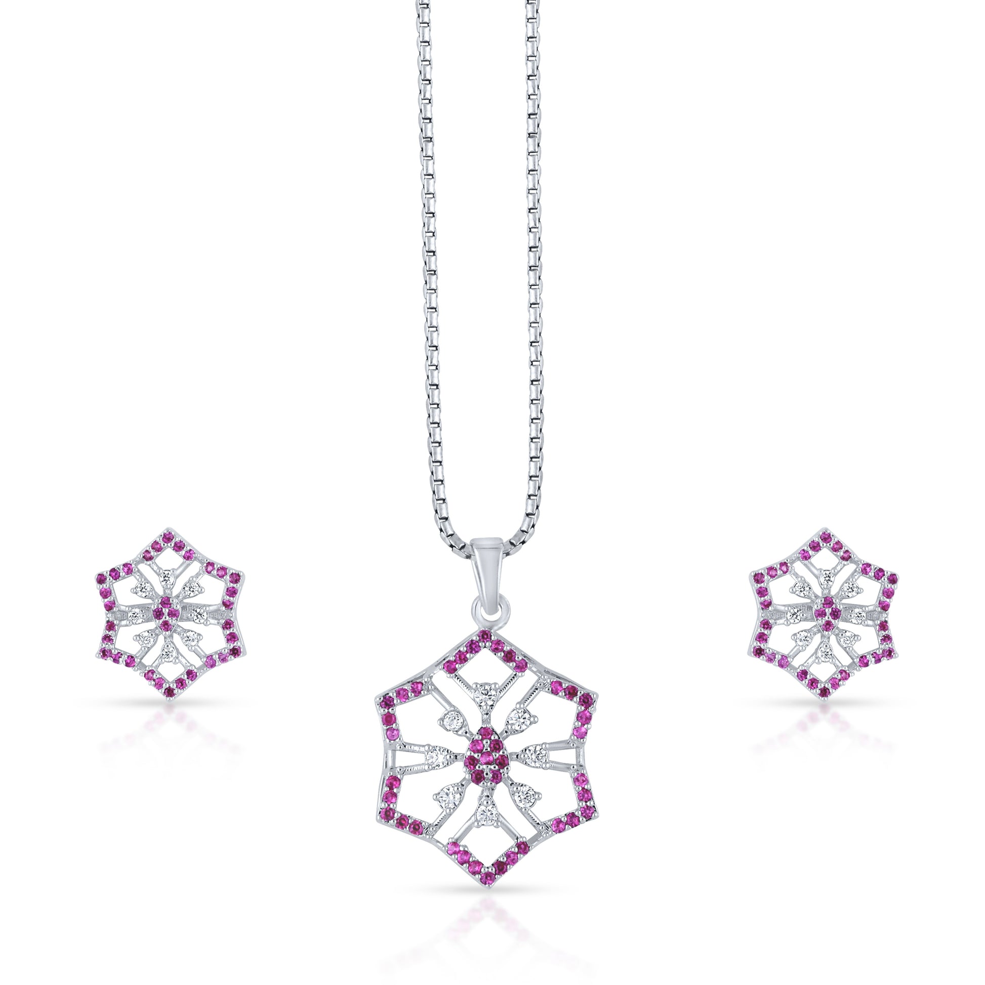 The Crystal Bloom Set is inspired by the geometry of nature where flowers unfold in perfect symmetry. Its six-petal silhouette sparkles with cubic zirconia, framed by a halo of deep pink stones that add vibrance and contrast. A piece that blends delicacy with bold radiance.