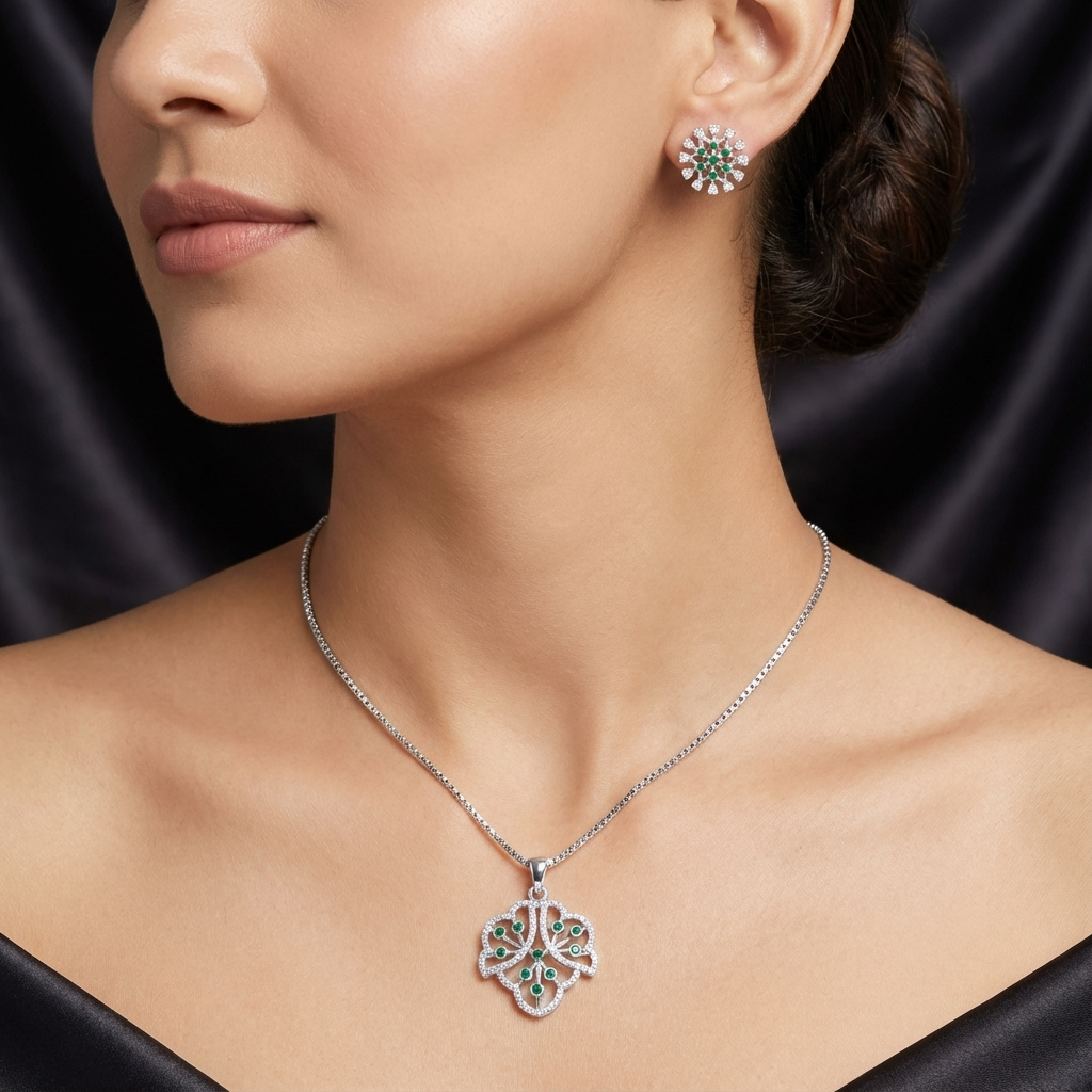 Green Grace celebrates the quiet poetry of new leaves unfurling — a delicate floral motif dotted with fresh green accents that feel both modern and timeless. The openwork pendant motif and matching studs capture light with gentle motion, while the emerald-hued details lend a calm, refined pop of colour.