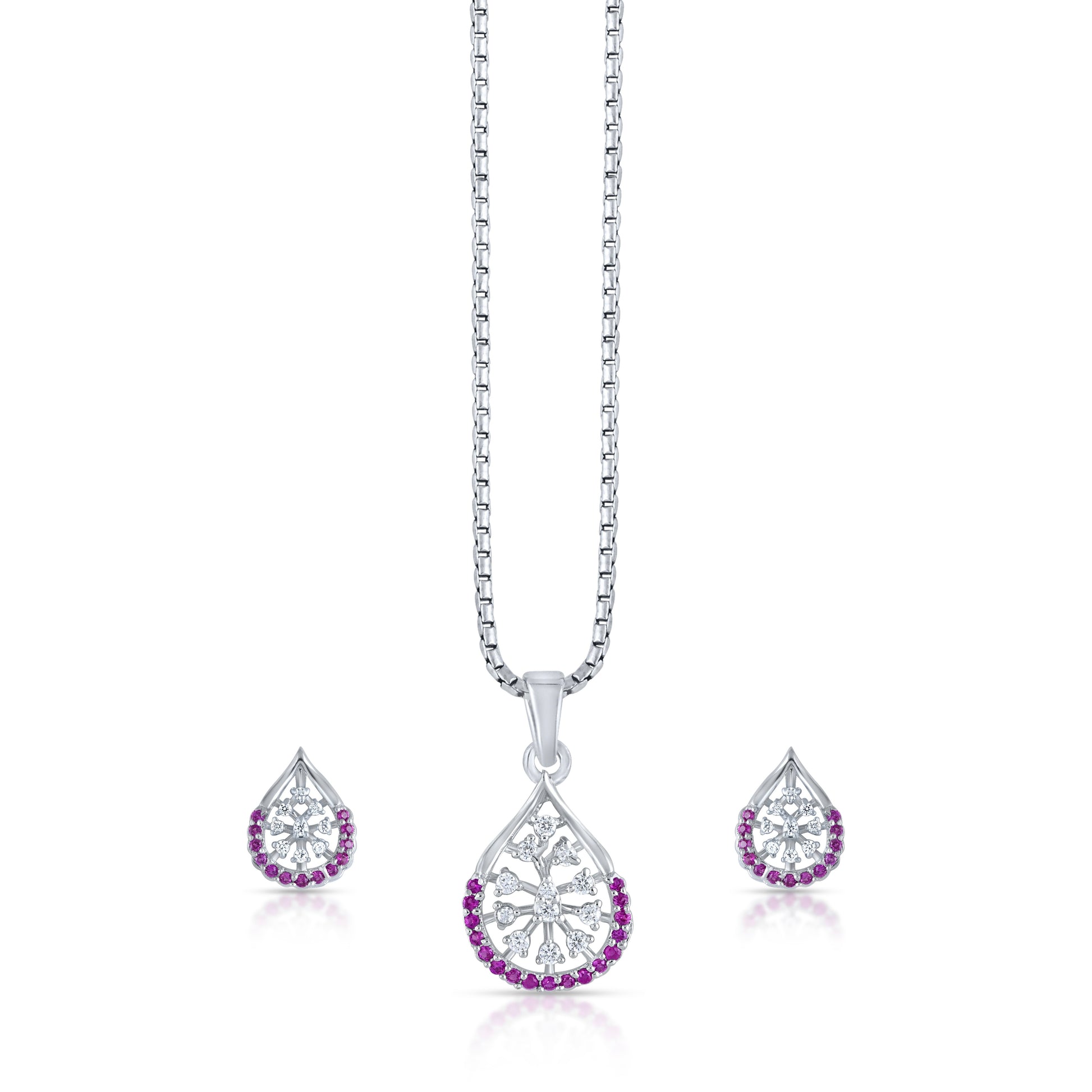 - Stones: White cubic zirconia with a crimson-pink halo in a teardrop design